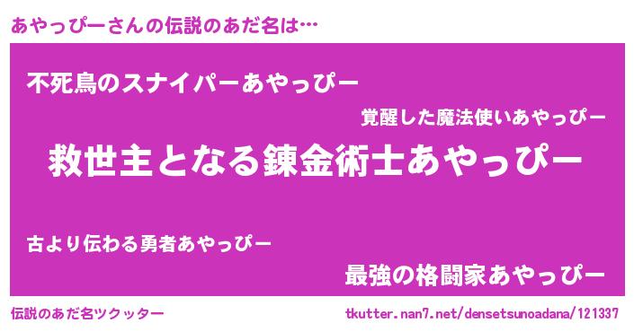 | ヒーロー風カッコイイあだ名 | 『最強戦士アヤッピー』『仮面アヤダー』 |