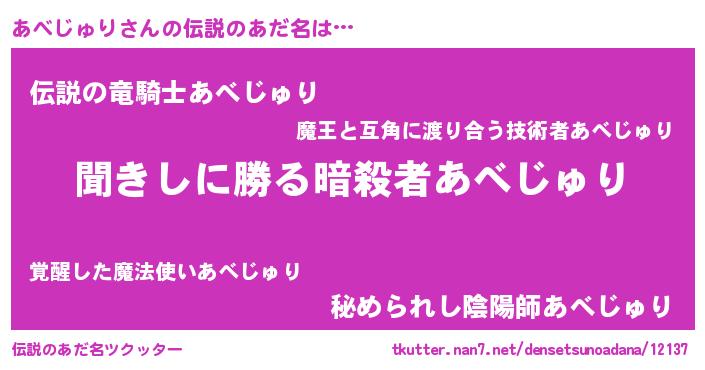 | ヒーロー風カッコイイあだ名 | 『超時空戦士アベジュリ』『仮面アベダー』 |