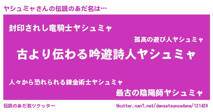 | ヘコむあだ名 | 『ヤシュミャ(笑)』『ヤシにー』 |