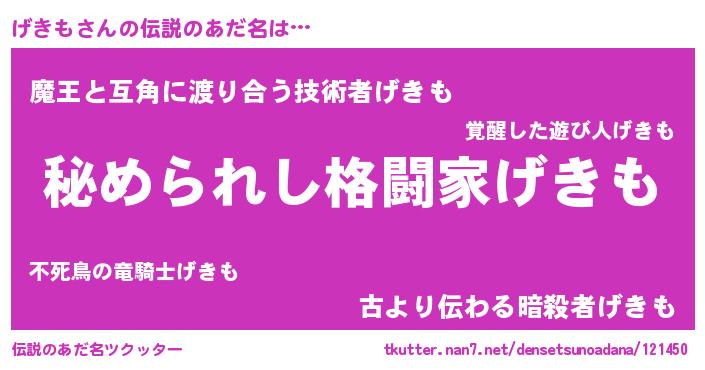 | 意味不明あだ名 | 『住所不定無職げきも(1歳)』『自称げきも』 |