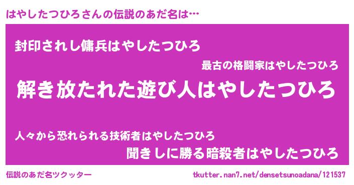 | 男性向けラノベタイトル風あだ名 | 『転生したらはやしたつひろだった件』 |