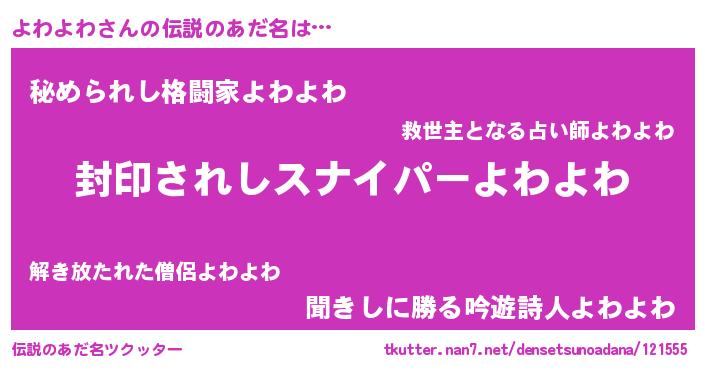 | ヒーロー風カッコイイあだ名 | 『仮面ヨワダー』『超時空戦士ヨワヨワ』 |