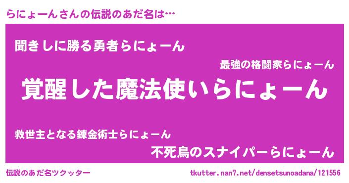| 男性向けラノベタイトル風あだ名 | 『らにょーんの嫁は女の子じゃないと思った?』 |