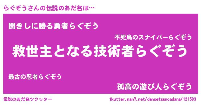 | 男性向けラノベタイトル風あだ名 | 『この素晴らしい世界にらぐぞうを!』 |