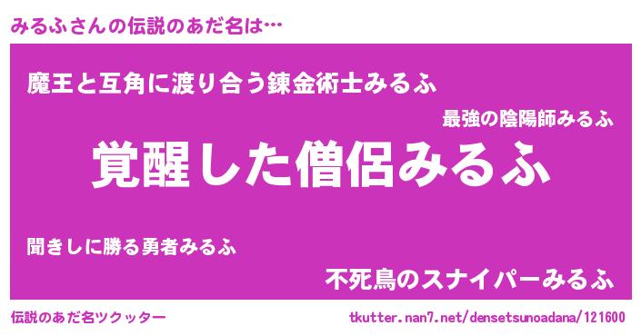 | 男性向けラノベタイトル風あだ名 | 『みるふに滅ぼされるだけの簡単なお仕事です』 |