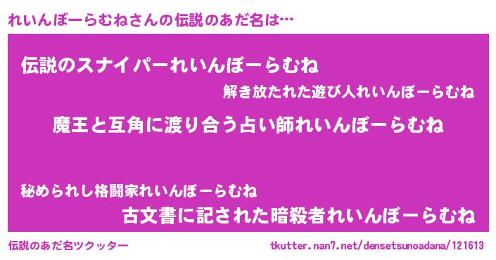 | 男性向けラノベタイトル風あだ名 | 『転生したられいんぼーらむねだった件』 |