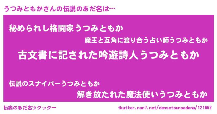 | 男性向けラノベタイトル風あだ名 | 『うちのうつみともかが世界を掌握している!』 |