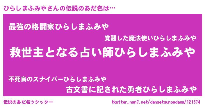 | 女子向けラノベタイトル風あだ名 | 『死神ひらしまふみやの再婚』 |