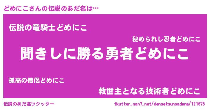 | 男性向けラノベタイトル風あだ名 | 『どめにこという概念が存在しない退屈な世界 』 |
