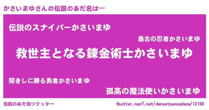 | ヒーロー風カッコイイあだ名 | 『仮面カサダー』『正義の使者かさいまゆ』 |