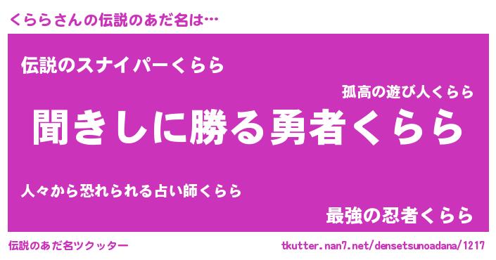 | 胡散臭い通販商品みたいなあだ名 | 『絶対に幸福をもたらす水素水…その名も「くらら」』 |