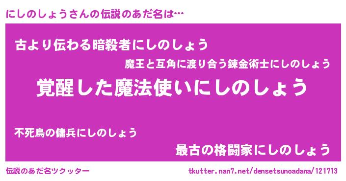 | 男性向けラノベタイトル風あだ名 | 『にしのしょうの嫁は女の子じゃないと思った?』 |