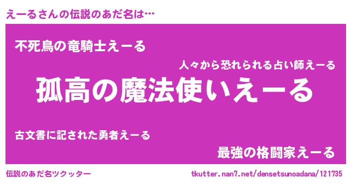 | 意味不明あだ名 | 『とにかく怪しいえーる』『自称えーる』 |