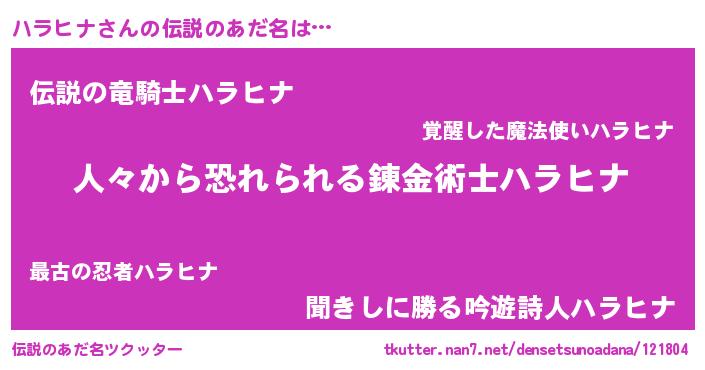 | 男性向けラノベタイトル風あだ名 | 『おまえをオタクにしてやるから、俺をハラヒナにしてくれ! 』 |