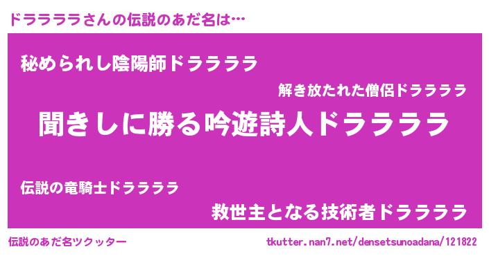 | 女子向けラノベタイトル風あだ名 | 『ドララララが死なない童話 林檎のドララララの診療簿』 |