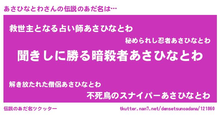 | ヘコむあだ名 | 『あさひなとわ(笑)』『あさっふぃ~』 |