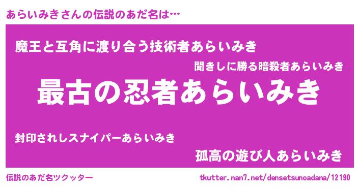 | 意味不明あだ名 | 『住所不定無職あらいみき(39歳)』 |