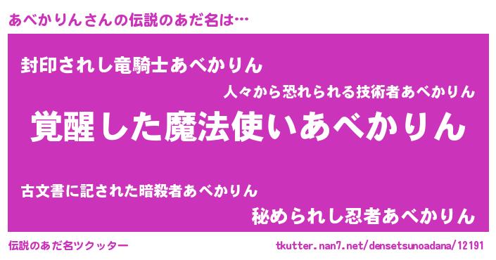 | 男性向けラノベタイトル風あだ名 | 『あべかりんの嫁は女の子じゃないと思った?』 |
