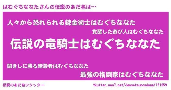 | 意味不明あだ名 | 『自称はむぐちななた』 |