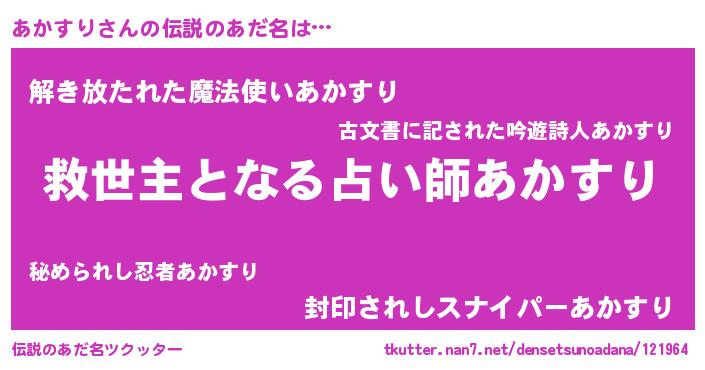 | ヒーロー風カッコイイあだ名 | 『天空の使者あかすり』『天弓騎士アカ』 |