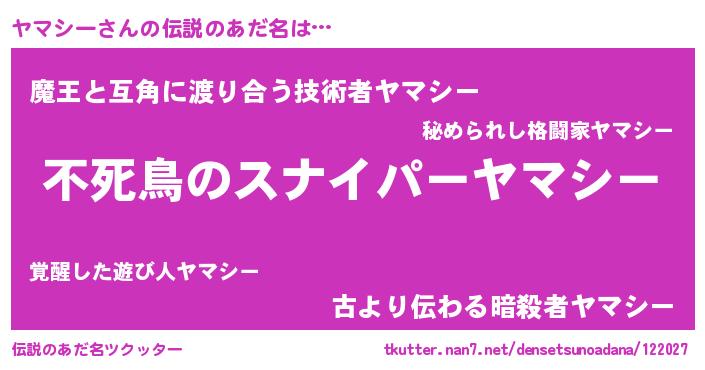 | 男性向けラノベタイトル風あだ名 | 『ヤマシーの憂鬱』『魔弾の王とヤマシー』 |