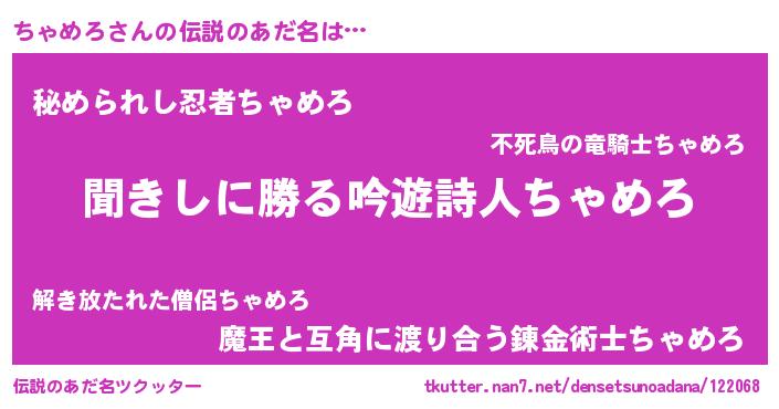 | 女子向けラノベタイトル風あだ名 | 『異世界で失敗しない100のちゃめろ』 |
