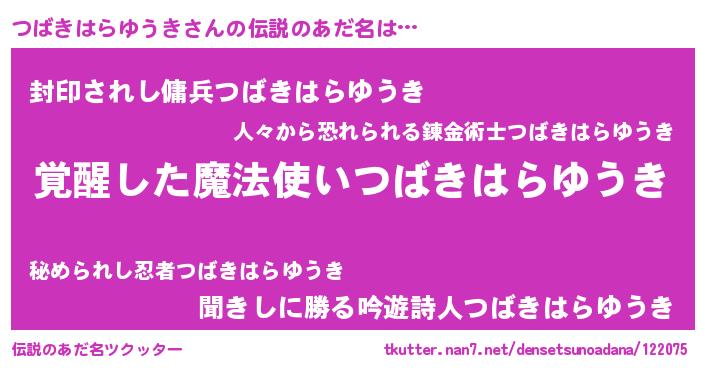 | 男性向けラノベタイトル風あだ名 | 『つばきはらゆうきの嫁は女の子じゃないと思った?』 |
