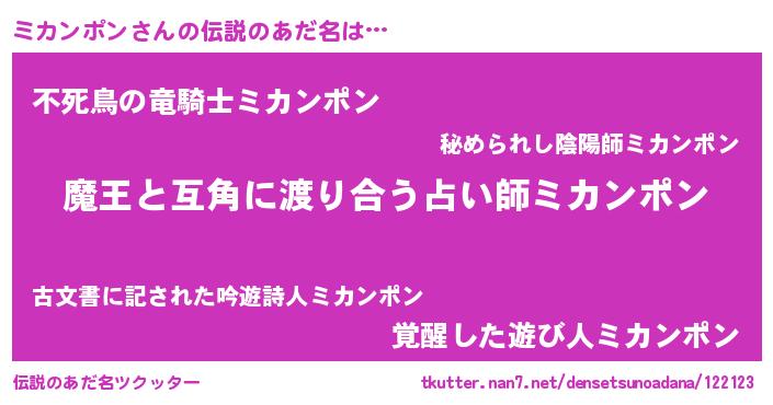 | ヒーロー風カッコイイあだ名 | 『友情の使者ミカンポン』『天弓騎士ミカ』 |