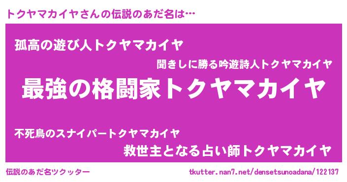 | ヒーロー風カッコイイあだ名 | 『仮面トクダー』『炎刃騎士トク』 |