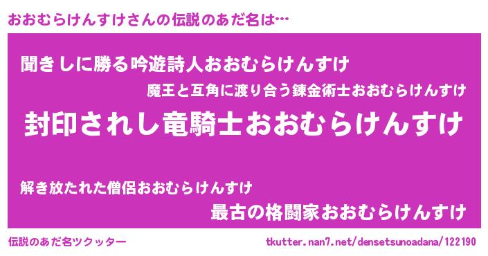 | 男性向けラノベタイトル風あだ名 | 『オオムラケンスケアートオンライン』 |