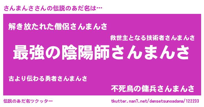 | 意味不明あだ名 | 『住所不定無職さんまんさ(95歳)』 |