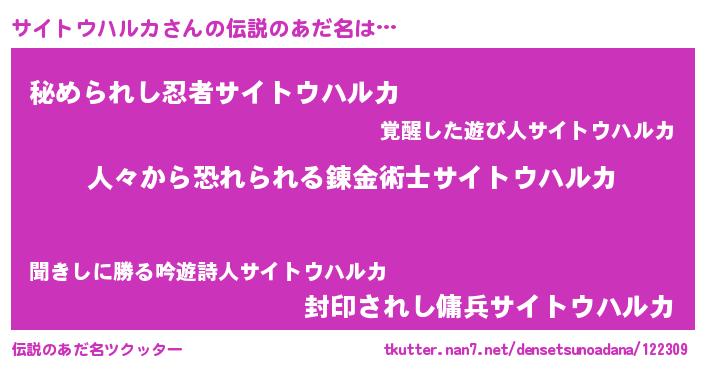 | 女子向けラノベタイトル風あだ名 | 『サイトウハルカが死なない童話 林檎のサイトウハルカの診療簿』 |