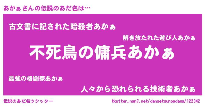 | 女子向けラノベタイトル風あだ名 | 『あかぁ姫と円卓の騎士』『あかぁ恋絵巻』 |