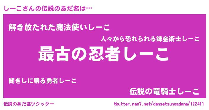 | 意味不明あだ名 | 『しーこフォーエバー』『ペロリンしーこ』 |
