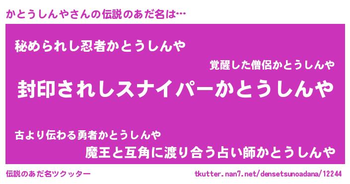 | ヒーロー風カッコイイあだ名 | 『スーパーカトウシンヤ』『天弓騎士カト』 |
