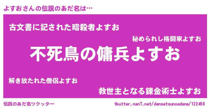 | 女子向けラノベタイトル風あだ名 | 『よすお姫と円卓の騎士』『闇のよすお』 |