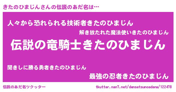 | 男性向けラノベタイトル風あだ名 | 『キタノヒマジンスレイヤー』 |