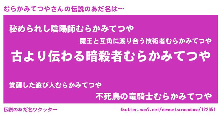 | 女子向けラノベタイトル風あだ名 | 『むらかみてつやの契約王妃』 |