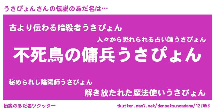 | 女子向けラノベタイトル風あだ名 | 『うさぴょん姫と円卓の騎士』 |