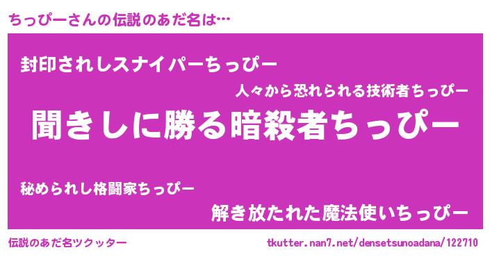 | 胡散臭い通販商品みたいなあだ名 | 『絶対に幸福をもたらす健康食品…その名も「ちっぴー」』 |