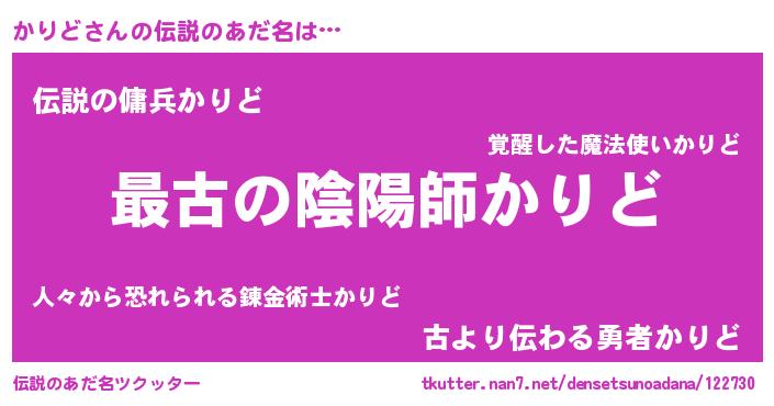 | 女子向けラノベタイトル風あだ名 | 『かりど伯爵の花嫁』『かりどの契約王妃』 |