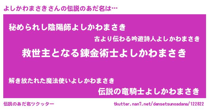 | 男性向けラノベタイトル風あだ名 | 『ノーゲーム・ノーヨシカワマサキ』 |