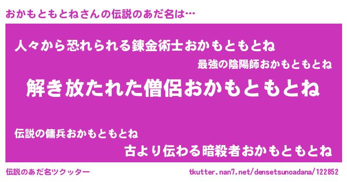 | 男性向けラノベタイトル風あだ名 | 『おかもともとねの嫁は女の子じゃないと思った?』 |