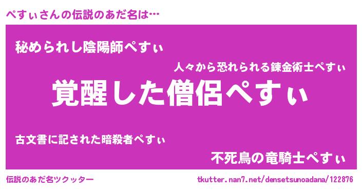 | 男性向けラノベタイトル風あだ名 | 『ぺすぃに滅ぼされるだけの簡単なお仕事です』 |
