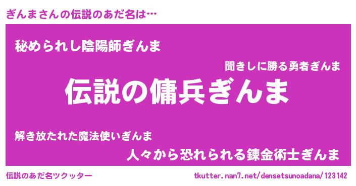 | 男性向けラノベタイトル風あだ名 | 『魔弾の王とぎんま』『ぎんまの憂鬱』 |