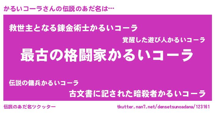 | 男性向けラノベタイトル風あだ名 | 『魔弾の王とかるいコーラ』 |