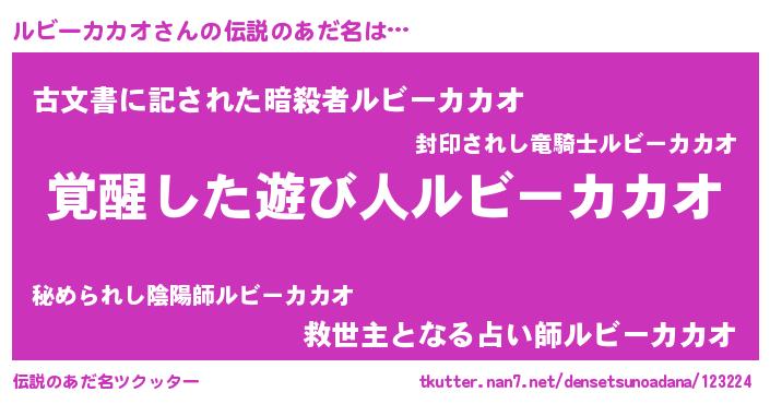 | ヒーロー風カッコイイあだ名 | 『天弓騎士ルビ』『ネオルビーカカオ』 |