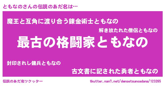 | 男性向けラノベタイトル風あだ名 | 『ともなのに滅ぼされるだけの簡単なお仕事です』 |