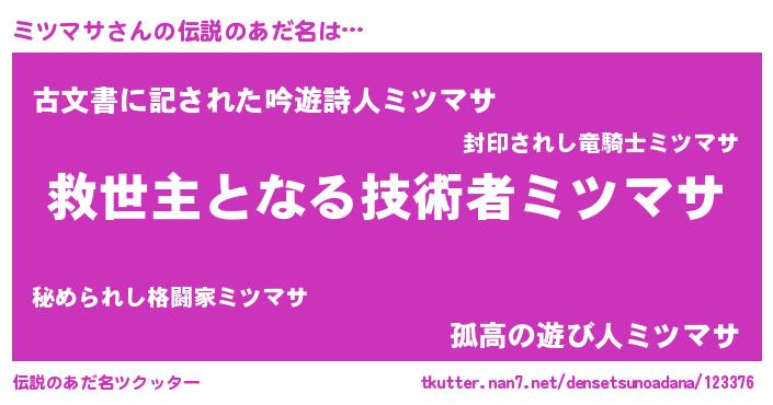 | 意味不明あだ名 | 『ヨモギ科ミツマサ属』『自称ミツマサ』 |