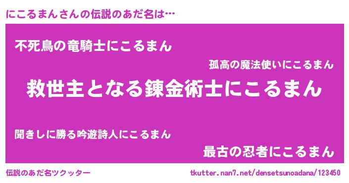 | ヒーロー風カッコイイあだ名 | 『天空の使者にこるまん』『仮面ニコダー』 |
